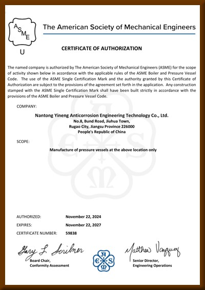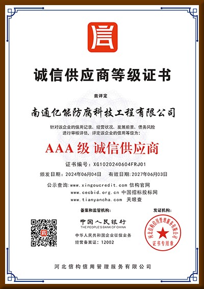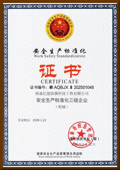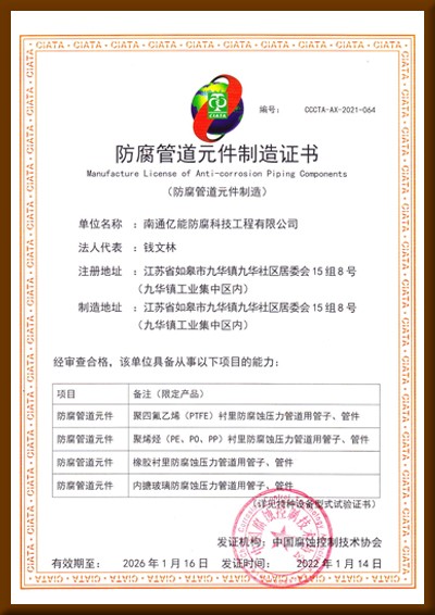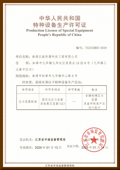 公司同时拥有一、二、三类压力容器设计和制造许可证,公司已取得百项荣誉证书,而且拥有多项实用新型专利ZL202120093628.6。公司长期聘请科研院所专家担任技术顾问,技术力量雄厚、生产设备先进、检测手段完善,是目前国内集防腐环保设备研发、销售;防腐保温工程施工;技术咨询服务;化工机械、玻璃钢设备、衬胶设备、衬塑设备、衬四氟设备、衬玻璃树脂鳞片设备的制造、销售、施工为一体的大型高科技企业,先后为全国数百家石油、化工、冶炼、化纤、电药及水外理等行业,配套供应了各种防腐材料及防腐工程施工,赢得了用户一致好评,从而使公司成为重合同守信用企业,中国防腐协会会员企业,ISO9001国际质量认证企业,综合实力得到不断提升。